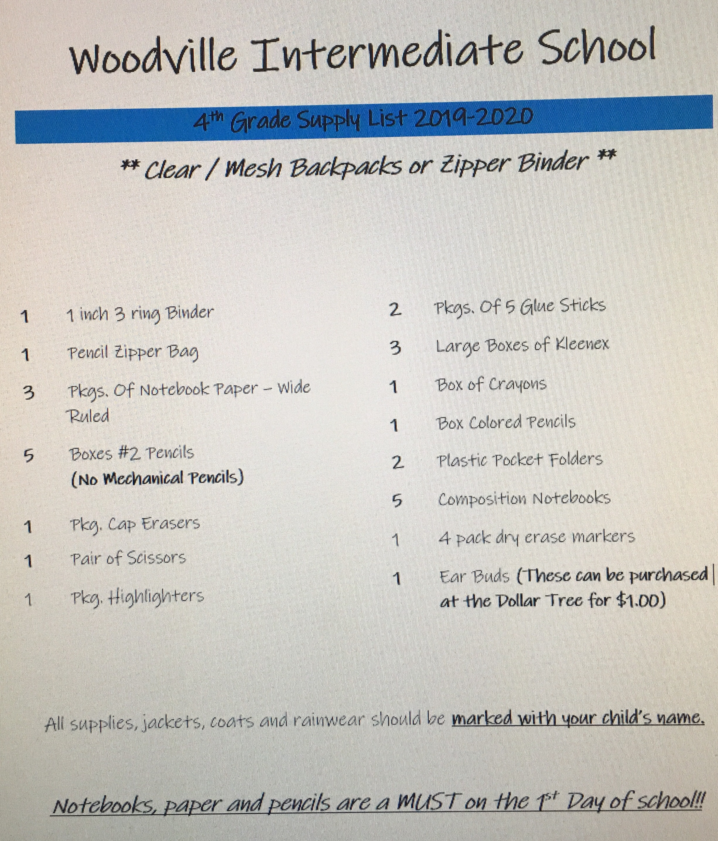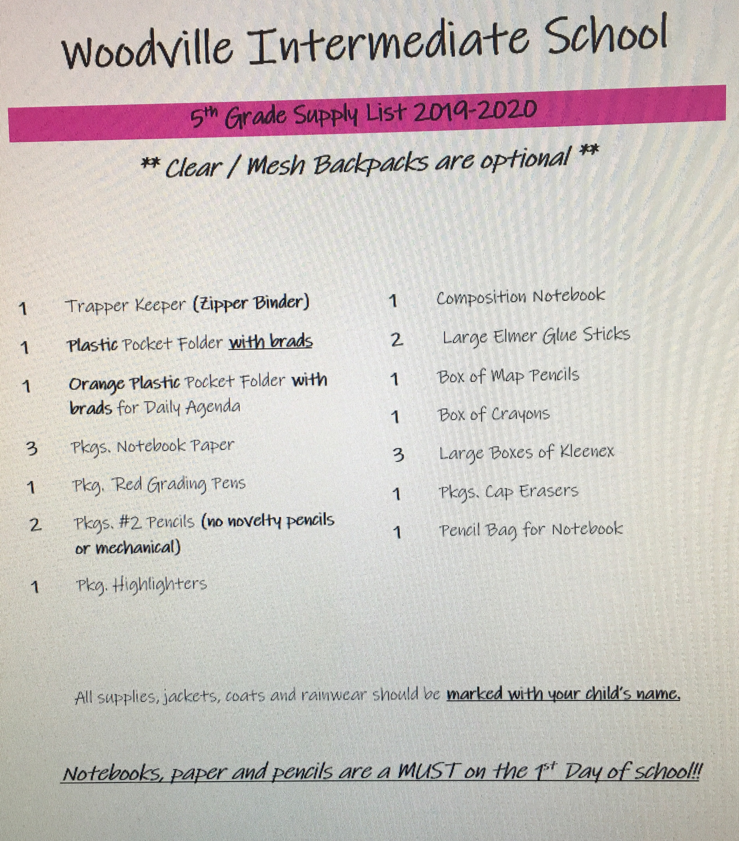 School supply list for 2019-2020 school year
